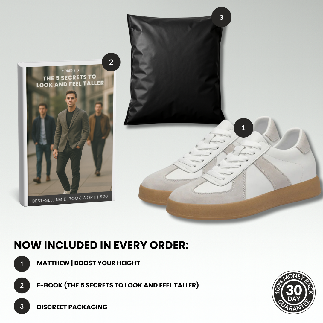 The Matthew delivers a clean, contemporary silhouette with a discreet internal lift — perfect for men who want a refined, versatile look and an extra boost of confidence in their stride.